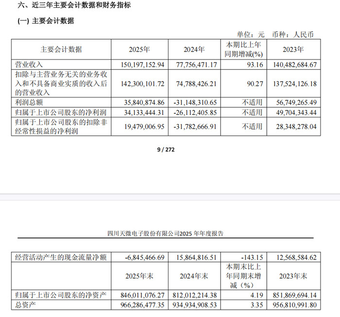 2月27日晚间,*ST天微(下称:天微电子)正式披露2025年年度报告,成为四川首家交出2025年度经营“成绩单”的A股上市公司。报告显示,公司全年实现营业收入1.5亿元,同比增长93.16%;归母净利润3413.34万元,成功扭亏为盈,核心财务指标已不再触及退市风险警示标准。公司同步公告,将向上交所申请撤销退市风险警示(*ST),正式启动“摘帽”流程,为川股2025年年报季拉开序幕。